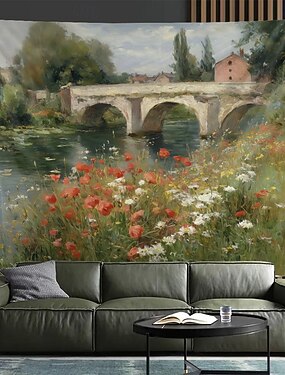 Импрессионистский сельский пейзаж, каменный мост, красные маки, река, стена, гобелен, французский сельский пейзаж, живопись маслом, подвесной декор для гостиной, спальни, деревенский стиль, домашнее