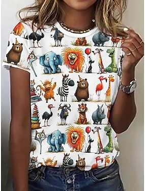 Жен. Футболка Летние вершины С принтом Графика Животное Классика На каждый день С короткими рукавами Вырез под горло Укороченные топы Повседневные выходные Цвет радуги Лето Весна Осень