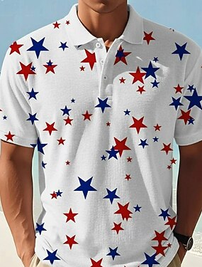 4 июля 2026 г., 250-летие Муж. Звезда Поло С короткими рукавами Футболки поло Рубашки с воротником На каждый день Одежда для спорта и отдыха Пуговицы Лето Белый
