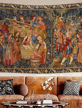 средневековый сбор винограда, прессование винограда, деревенская жизнь эпохи Возрождения, люди, собирающие урожай на винограднике, винные бочки, цветочный бордюр, настенный гобелен, настенное