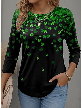 Футболка для женщин на День Святого Патрика графический дизайн с клевером модная стильная современная длинный рукав круглый вырез обычная модель ежедневная выходная печать белый зеленый весна зима