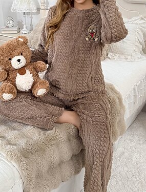 Жен. Пижамы Домашняя одежда Фланель Теплый Мода Чистый цвет Кулиска Эластичная талия Брюки Отпуск Дом Повседневные Длинный рукав Вырез под горло Коричневый Серый Осень Зима Свободное облегание
