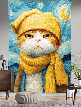 Забавная пародия на Ван Гога: кот в желтой шляпе и шарфе, картина маслом «Звездная ночь», настенный гобелен для гостиной, спальни, общежития, подарок для любителей кошек.