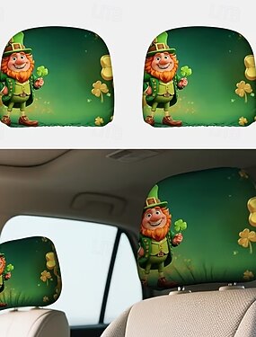 2 шт. чехла на подголовники автомобиля в виде зеленого клевера | подходят для всех автомобилей, черные &Зелёный принт в виде клевера, двухмерный плоский дизайн, полиэстер, легко устанавливается -
