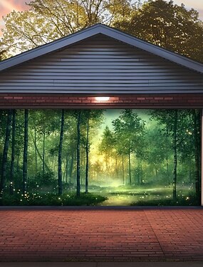 зачарованный лес, магия, светящиеся зеленые деревья, солнечный свет, туман, пруд, природа, пейзаж, гаражные ворота, баннер, наружная фреска, декор стен, сад, дом, экстерьер, фон для вечеринки