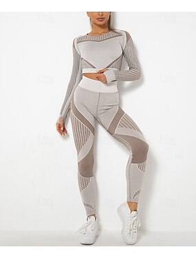 Жен. 2 предмета Костюм для йоги Тренировочный комплект из 2 предметов В полоску Наборы одежды Лето Темно-серый Черный Тренировка в тренажерном зале Волейбол Бег Завышенная Стреч Дышащий Спорт