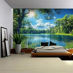 Природа, лес, озеро и солнечный свет, реалистичный 3D-пейзаж, настенные гобелены, зеленые деревья, голубое небо, летний пейзаж, подвесной гобелен для спальни, гостиной, домашнего офиса, декор стен.