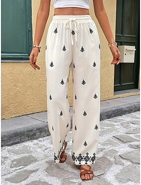 Жен. Чино Брюки палаццо Отпуск Уличный стиль На каждый день Полная длина Нормальная Цветочный принт Кулиска Карман С принтом Удобный Неэластичная Повседневные на открытом воздухе Для улицы Белый