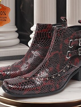 мужские кожаные ботинки со змеиным рисунком — темно-красные, смелые и модные, идеально подходящие для стиля рок-н-ролл