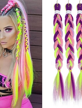 26-дюймовые цветные волосы для плетения кос, предварительно растянутые, с эффектом омбре, для девочек, 4 цвета, смесь синтетических волос, флуоресцентный зеленый/розовый/фиолетовый/лавандовый, 3