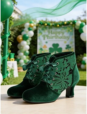 Женские зеленые бархатные ботинки на шнуровке с цветочным кружевом – стильные туфли ко Дню Святого Патрика, винтажный дизайн для праздничных мероприятий и торжеств.