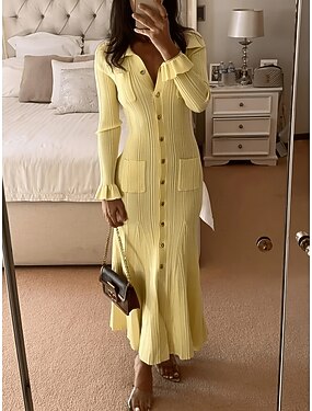 Жен. Длинное платье Платье-футляр На каждый день Повседневные Стандартный Полотняное плетение Длинный рукав Зубчатая шея Черный Белый Желтый Весна Осень Зима
