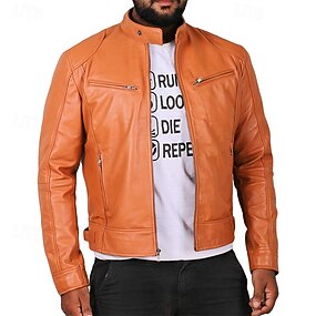 Муж. Кожаные куртки Куртка переходного периода Байкерская куртка Красная кожаная куртка Официальные Для улицы Сохраняет тепло С защитой от ветра Регулируется Осень Чистый цвет Формальная