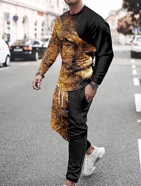 Муж. Спортивный костюм Тренировочный костюм Коричневый Вырез под горло Графика Лев Повседневные Праздники На каждый день Большой и высокий Спортивная Весна & осень Одежда Толстовки Толстовки