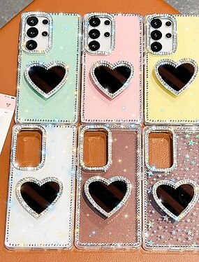 телефон Кейс для Назначение SSamsung Galaxy S25 S24 Ultra Plus S24 ФЭ S23 A16 A55 5G А35 5G A15 Кейс на заднюю панель Зеркальная поверхность Откидная подножка Защита от удара С сердцем Силикон