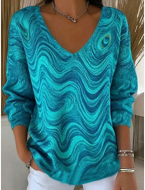 Жен. Вязаная ткань Пуловер Мода Уличный стиль На каждый день Графика Полоски V-образный вырез Крупногабаритные Трикотаж Длинный рукав Обычные топы Вязать на открытом воздухе Повседневные Синий