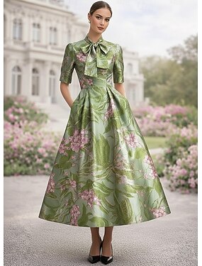 А-силуэт Ниже колена коктейльные платья Элегантный стиль Винтаж С цветами С короткими рукавами Вырез под горло Вечеринка в саду Свадьба Карман Сатин Вырез с драпировкой на спине с