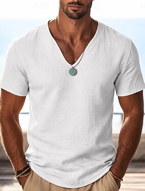 Муж. Футболка Рубашка с коротким рукавом Футболка из льна С короткими рукавами V-образный вырез Лето Весна Сплошной цвет Полотняное плетение Пит Стрип Уличный стиль Стиль На каждый день Гладкая ткань
