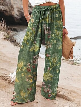 Жен. Широкие Брюки Брюки палаццо Винтаж Богемный Полная длина Завышенная Цветы Эластичная талия Рисунок Воздухопроницаемость Удобный Для улицы На каждый день На выход Зеленый Весна Осень Стандартный