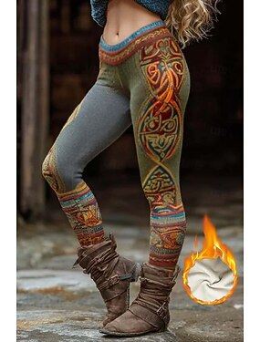 Леггинсы для женщин викингов бохо с флисовой подкладкой леггинсы отпуск винтажный этнический стиль полный длины высокой талии геометрический узор 3D печать термо теплые ветрозащитные удобные
