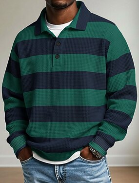 Муж. Горизонтальные полосы Рубашки-поло из вафельной ткани Рубашки-поло для регби Длинный рукав Футболки поло Рубашки с воротником На каждый день Одежда для спорта и отдыха На каждый день Пуговицы