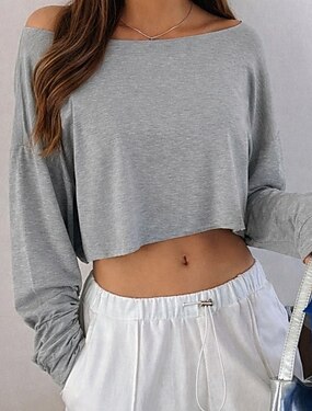 Жен. Футболка Футболки Сплошной цвет Графика Полотняное плетение Элегантный стиль Стиль горячий Длинный рукав Вырез лодочкой С открытыми плечами Укороченные топы Повседневные На выход Серый