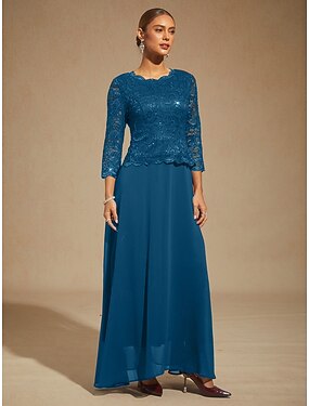 Женское макси-платье, шифоновое кружевное платье, элегантное платье для гостей свадьбы, однотонное, с рукавами длиной 3/4, круглым вырезом, павлиньего цвета, весна-осень-зима