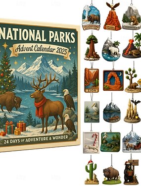 Адвент-календарь национальных парков 2025, 24-дневный рождественский календарь с обратным отсчётом и 24 коллекционными украшениями с изображением ландшафтов и диких животных из национальных парков Америки. Подарок для любителей природы и семей.