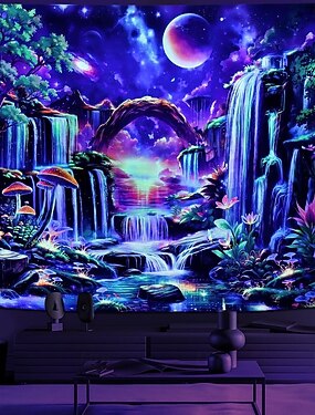 Черный гобелен с изображением леса в стиле фэнтези, неоновые гобелены с водопадом, гобелены с УФ-реактивными изображениями галактик и космоса, цветные гобелены с растениями, настенные фоны, декор для