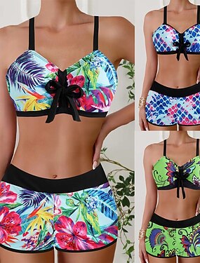 Жен. Купальники 2 шт. Шорты купальник Открытая спина Отпуск Одежда для пляжа Цветочный принт U-образный вырез Без рукавов Купальники
