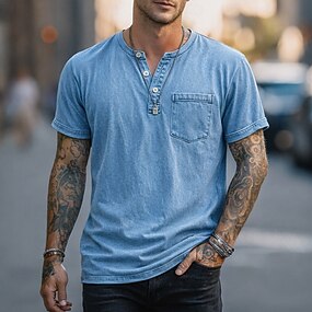 Муж. Футболка Рубашка Хенли Джинсовая рубашка Рубашка из 100% хлопка с кислотной стиркой С короткими рукавами Полотняное плетение Один цвет Винтаж Уличный стиль На каждый день