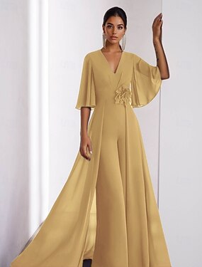 Брючный костюм В пол Вечернее платье Бальное платье с верхней юбкой Торжественное платье Элегантный стиль Винтаж С короткими рукавами V-образный вырез Официальные Шифон с Рюши Оборки