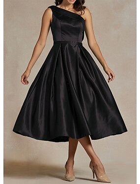 А-силуэт Ниже колена коктейльные платья Вечернее платье С пышной юбкой Торжественное платье Элегантный стиль Асимметричный крой Рукав 3/4 На одно плечо Официальные лето Сатин с Бант(ы)