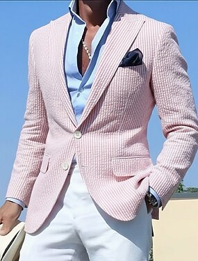 Муж. Пиджак Воротник с вырезом Мода Легкие Классика Полоски Blazer Костюмы из сирсакера Блейзер из сирсакера Розовый Небесно-голубой Узкий крой Однобортный с двумя пуговицами