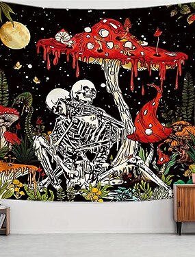 психоделический скелет, любовники, красный тающий гриб, луна, звезды, готический ботанический инди-эстетичный настенный гобелен, настенное украшение для спальни, общежития, гостиной, квартиры,