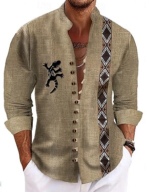 Муж. Этнический Индийская культура Геккон Рубашка Рубашка с воротником-стойкой Длинный рукав Винтаж Ретро Отпуск На каждый день На выход Весна Осень Китайский воротник-стойка Воротник-стойка