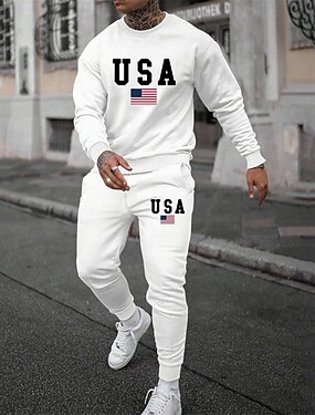 Муж. Толстовка Спортивный костюм Комплект одежды Вырез под горло на открытом воздухе Повседневные Спорт Кулиска Карман 3D печать Американский флаг Черный / белый Черный Белый Полиэстер