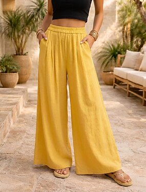 Жен. Широкие Отпуск Классический Полная длина Нормальная Полотняное плетение Комфорт Неэластичная Повседневные Белый Желтый Темно-синий Лето Весна Свободное облегание