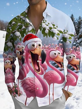 Новогодняя тематика Муж. Фламинго Птица Рождественское животное Рубашка Кнопка рубашка Длинный рукав Веселая на открытом воздухе Праздники Весна Осень Отложной 3D печать рубашки с воротником Синий