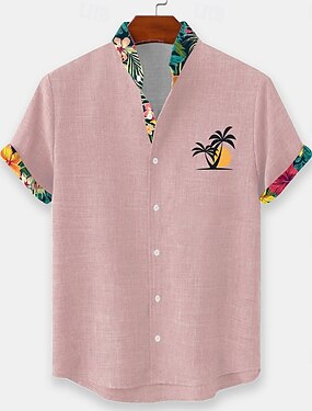 Муж. Птица Цветочный принт Цветы Рубашка Льняная рубашка Рубашка Алоха Длинный рукав На каждый день Отпуск На каждый день На выход Весна Воротник-стойка Кнопка вниз Желтый Розовый