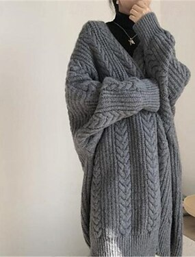 Жен. Вязаная ткань Кардиган Мода Уличный стиль Повседневные Сплошной цвет Рельефный узор V-образный вырез Трикотаж Длинный рукав Длинные топы Вязать Праздники На выход выходные Хаки Светло-серый
