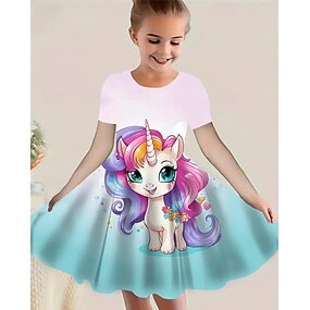Девушки ' 3D единорогом Платье С короткими рукавами Лето Весна Отпуск Повседневные Праздники Принцесса Красивый Милая Дети 4-12 лет Повседневное платье До колена Стандартный