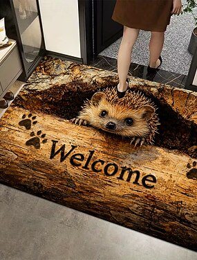 Придверный коврик с изображением ежика, милый дизайн с отпечатками лап, прочный и приветливый, для украшения дома.