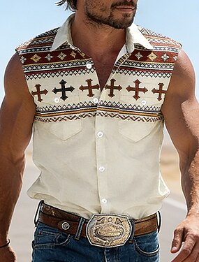 Муж. Крест Этнический Блокировка цвета Западная рубашка Ковбойская рубашка Безрукавка Без рукавов Винтаж западный стиль на открытом воздухе Отпуск Лето Весна Отложной 3D печать Рубашки на пуговицах