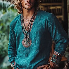 Муж. Рубашка Льняная рубашка Поповер Рубашка Летняя рубашка Пляжная рубашка Винтажная рубашка Полотняное плетение Отпуск Повседневные Синий Длинный рукав V-образный вырез Лето Весна Одежда