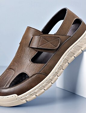 Мужские коричневые дышащие сандалии для рыбалки из искусственной кожи — застежка-липучка, повседневный закрытый носок, удобная летняя обувь для активного отдыха и повседневной носки