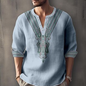Муж. Этнический Рубашка Кнопка рубашка Рубашка Хенли Длинный рукав На каждый день Туземные Отпуск Повседневные Лето Весна Осень Без воротника V-образный вырез С принтом Синий Хаки