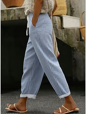 Жен. Искусственный хлопок и лен Брюки Повседневные брюки Отпуск Классический На каждый день По щиколотку Средняя талия Полоски геометрический Карман Рисунок Эластичный шнурок удобный Комфорт Удобный