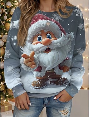 Новогодняя тематика Жен. Футболка Дед Мороз Северный олень В снежинку Винтаж Стиль Классика Длинный рукав Вырез под горло Круглый вырез Обычные топы выходные С принтом