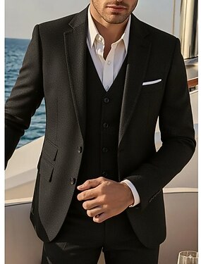 Мужской Повседневные Костюмы Лацкан с тупым углом Черный Темно синий Платья Однотонный Узкий крой Набор из 3 предметов